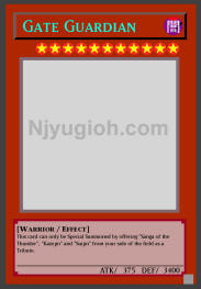 Gate Guardian DARK / Warrior / Level 11 / ATK 375 / DEF 3400 This card can only be Special Summoned by offering "Sanga of the Thunder", "Kazejin" and "Suijin" from your side of the field as a Tribute. SECRET RARE |