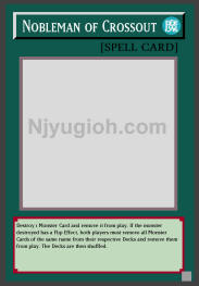 Nobleman of Crossout Normal Spell Destroy 1 Monster Card and remove it from play. If the monster destroyed has a Flip Effect, both players must remove all Monster Cards of the same name from their respective Decks and remove them from play. The Decks are then shuffled. SUPER RARE  |