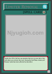 Limiter Removal Quick-Play Spell Double the ATK of all face-up monsters that are on your side of the field when you activate this card. During the End Phase, destroy all Monster Cards that were affected by this effect. RARE  |
