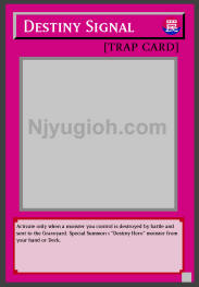 Destiny Signal Normal Trap Activate only when a monster you control is destroyed by battle and sent to the Graveyard. Special Summon 1 "Destiny Hero" monster from your hand or Deck. COMMON  |