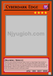 Cyberdark Edge DARK / Machine / Level 4 / ATK 800 / DEF 8000 When this card is Normal Summoned, select 1 Level 3 or lower Dragon-Type monster in your Graveyard and equip it to this card. This card gains ATK equal to the equipped card's ATK. This card can attack your opponent directly. If it attacks using this effect, the Battle Damage it inflicts to your opponent is halved. If this card would be destroyed by battle, the equipped monster is destroyed instead. SHORT PRINT COMMON  |