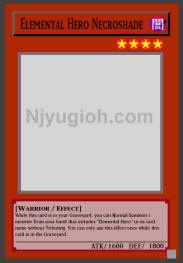 Elemental Hero Necroshade DARK / Warrior / Level 4 / ATK 1600 / DEF 1800 While this card is in your Graveyard, you can Normal Summon 1 monster from your hand that includes "Elemental Hero" in its card name without Tributing. You can only use this effect once while this card is in the Graveyard. SUPER RARE  |