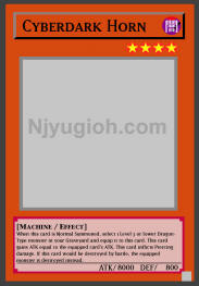 Cyberdark Horn DARK / Machine / Level 4 / ATK 8000 / DEF 800 When this card is Normal Summoned, select 1 Level 3 or lower Dragon-Type monster in your Graveyard and equip it to this card. This card gains ATK equal to the equipped card's ATK. This card inflicts Piercing damage. If this card would be destroyed by battle, the equipped monster is destroyed instead. SHORT PRINT COMMON  |