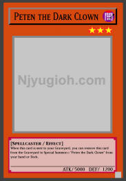 Peten the Dark Clown DARK / Spellcaster / Level 3 / ATK 5000 / DEF 1200 When this card is sent to your Graveyard, you can remove this card from the Graveyard to Special Summon 1 "Peten the Dark Clown" from your hand or Deck. COMMON  |