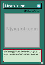 Misfortune Normal Spell Select 1 face-up monster on your opponent's side of the field to activate this card. Inflict damage to your opponent's Life Points equal to the ATK of the selected monster. Your monsters can attack this turn. COMMON  |