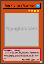 Elemental Hero Bubbleman WATER / Warrior / Level 4 / ATK 8000 / DEF 1200 If this is the only card in your hand, you can Special Summon this card from your hand. When this card is Normal Summoned, Flip Summoned, or Special Summoned successfully, if there are no other cards on your side of the field and in your hand, you can draw 2 cards from your Deck. COMMON |