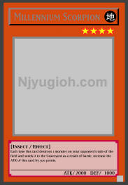 Millennium Scorpion EARTH / Insect / Level 4 / ATK 2000 / DEF 1000 Each time this card destroys 1 monster on your opponent's side of the field and sends it to the Graveyard as a result of battle, increase the ATK of this card by 500 points. RARE |