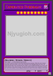 Chimeratech Overdragon DARK / Machine-Type Fusion / Level 9 / ATK ? / DEF ? "Cyber Dragon" + 1 or more Machine-Type monsters This monster cannot be Special Summoned except by Fusion Summon. When this card is Fusion Summoned, send all the cards on your side of the field to the Graveyard except this card. The original ATK and DEF of this card become the number of Fusion-Material Monsters you used for the Fusion Summon of this card x 8 points. This card can attack as many of your opponent's monsters each turn as the number of Fusion-Material Monsters you used for the Fusion Summon of this card. ULTRA RARE |