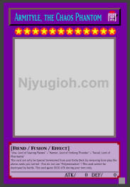 Armityle the Chaos Phantom DARK / Fiend-Type Fusion / Level 12 / ATK 0 / DEF 0 "Uria, Lord of Searing Flames" + "Hamon, Lord of Striking Thunder" + "Raviel, Lord of Phantasms" This card can only be Special Summoned from your Extra Deck by removing from play the above cards you control. (You do not use "Polymerization".) This card cannot be destroyed by battle. This card gains 1000 ATK during your turn only. SECRET RARE |