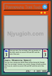 | Pendulum Scale 3 | Performapal Turn Toad WATER / Aqua-Type Pendulum / Level 2 / ATK 0 / DEF 8000 Pendulum Text: Once per turn: You can target 1 face-up monster on the field; switch its current ATK and DEF until the end of this turn. Monster Text: Once per turn, during your Battle Phase (except during the Damage Step): You can target 1 monster you control; change its battle position, and if you do, switch its current ATK and DEF until the end of this turn. RARE |
