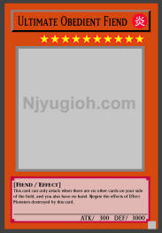 Ultimate Obedient Fiend FIRE / Fiend / Level 10 / ATK 350 / DEF 3000 This card can only attack when there are no other cards on your side of the field, and you also have no hand. Negate the effects of Effect Monsters destroyed by this card. COMMON |
