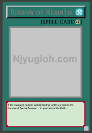 Ribbon of Rebirth Equip Spell If the equipped monster is destroyed by battle and sent to the Graveyard, Special Summon it to your side of the field. RARE |