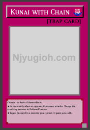 Kunai with Chain (original artwork) Normal Trap Choose 1 or both of these effects: ● Activate only when an opponent's monster attacks. Change the attacking monster to Defense Position. ● Equip this card to a monster you control. It gains 5000 ATK. SUPER RARE |
