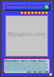 Shinobaron Peacock WIND / Winged Beast-Type Ritual-Type Spirit / Level 8 / ATK 300 / DEF 2500 You can Ritual Summon this card with "Shinobird's Calling". Must be Ritual Summoned, and cannot be Special Summoned by other ways. If this card is Ritual Summoned: You can return up to 3 monsters your opponent controls to the hand, then you can Special Summon 1 Level 4 or lower Spirit monster from your hand, ignoring its Summoning conditions. Once per turn, during the End Phase, if this card was Special Summoned this turn: Return it to the hand, and if you do, Special Summon 2 "Shinobird Tokens" (Winged Beast-Type/WIND/Level 4/ATK 1500/ DEF 1500). RARE |