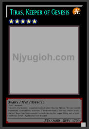 Tiras, Keeper of Genesis LIGHT / Fairy-Type Xyz / Rank 5 / ATK 2600 / DEF 1700 2 Level 5 monsters This card's effects cannot be applied/resolved while it has Xyz Material. This card cannot be destroyed by card effects. At the end of the Battle Phase, if this card attacked or was attacked: Target 1 card your opponent controls; destroy that target. During each of your End Phases: Detach 1 Xyz Material from this card. SECRET RARE |
